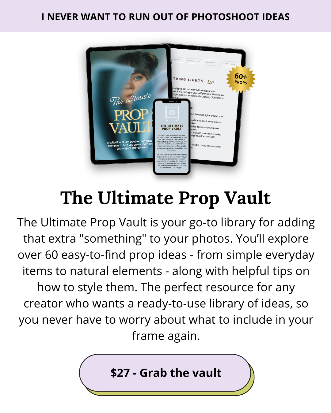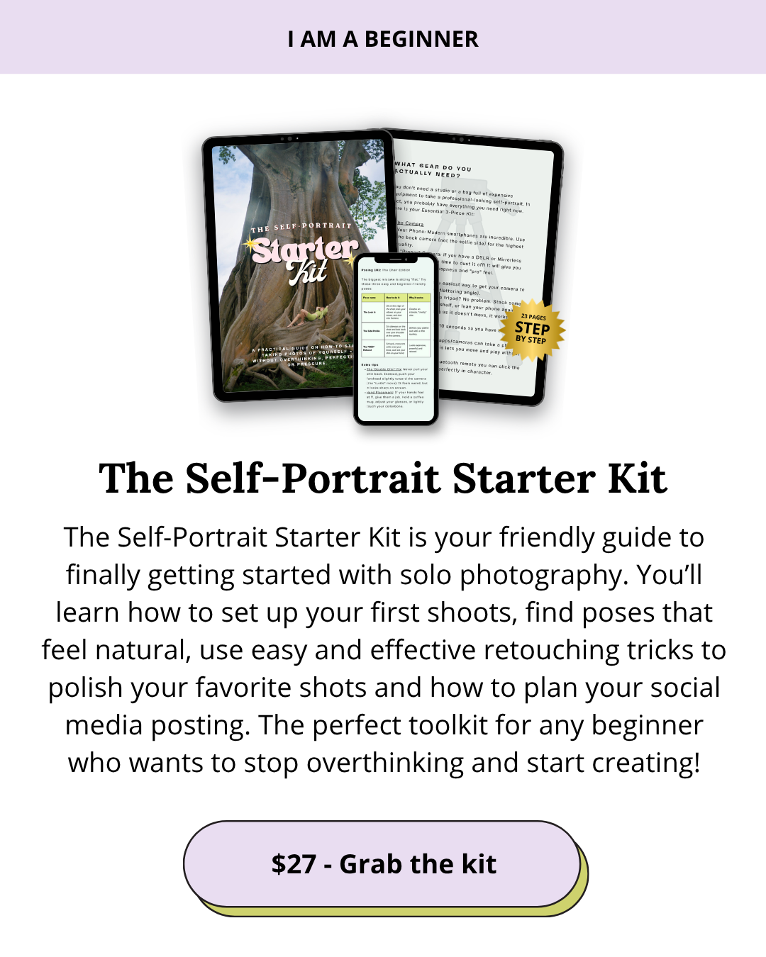 If you’re feeling shy and stuck, start with the Camera Confidence Playbook to get comfortable. If you’re ready to shoot but need a "spark," dive into the Prop Vault. If you’re ready to be your own muse, the Self-Portrait Starter Kit is your perfect first step!